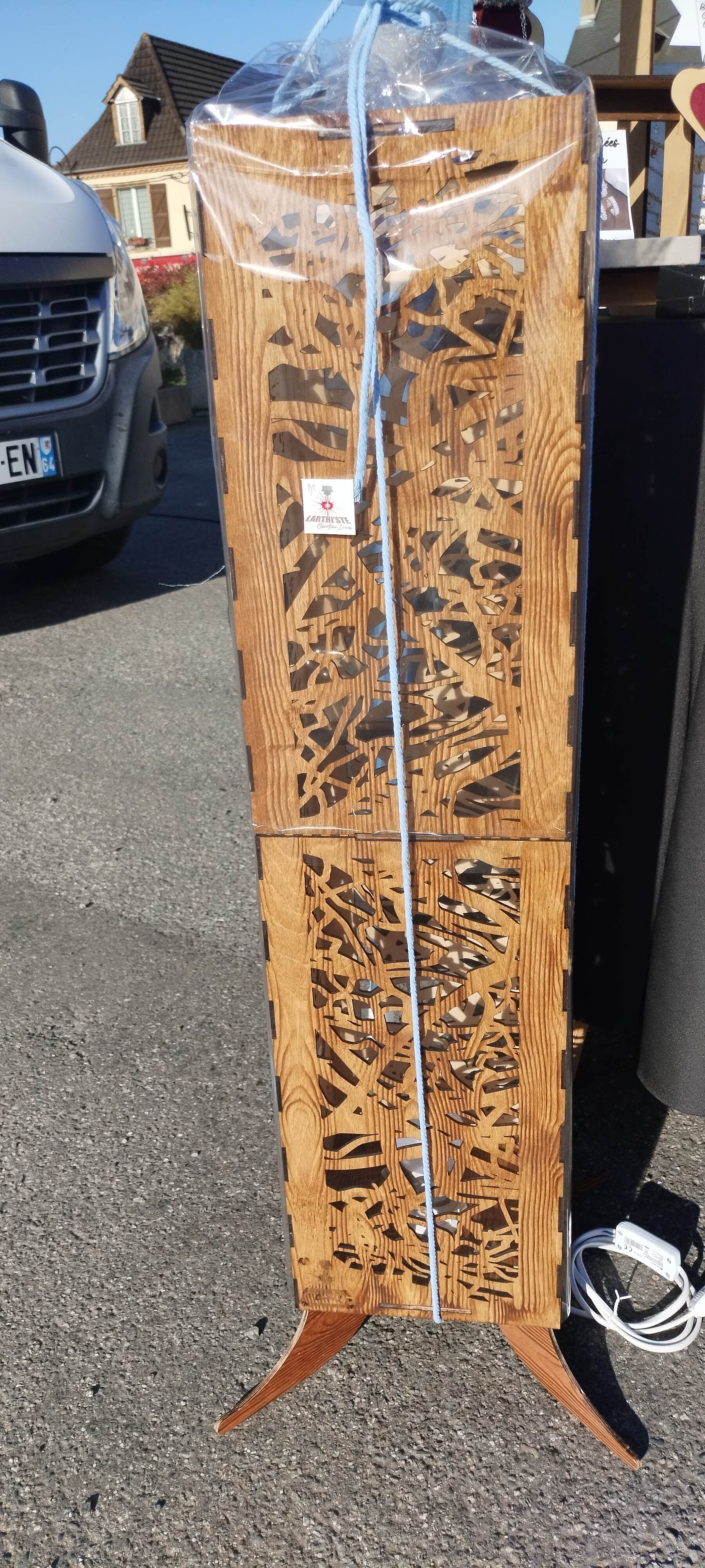 Lampadaire bois, gravé et découpe laser Hauteur 80 cm x 20 cm